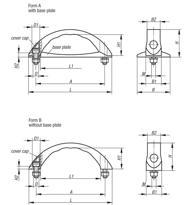 | Order No. | Form | A | B | B1 | B2 | D | D1 | H | H1 | H2 | L | L1 | M | Load bearing capacity N | Approx. weight kg | Surface finish |